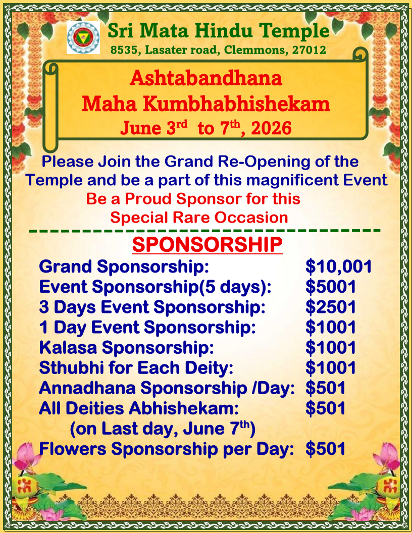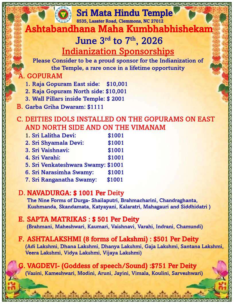 8535 Lasater Road, Clemmons NC 27012. Contact: info@matahindutemple.org